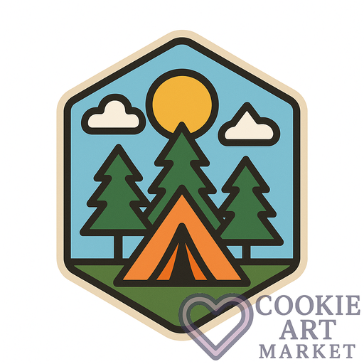 Step into the great outdoors with this playful Camping Badge cookie illustration! Perfect for nature enthusiasts, this design uses simple, bold colors to capture the spirit of adventure without any extra frills. Ideal for cookie decorating inspiration!