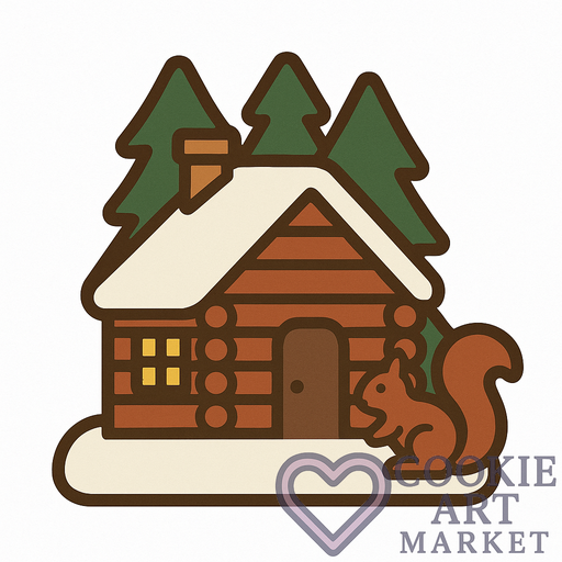 In the heart of a tranquil winter forest, a cozy cabin stands, nestled among the trees. A friendly squirrel adds a touch of life to this serene scene, captured in a beautifully simple illustration. Ideal for cookie designs, this image invokes the peacefulness of the season.