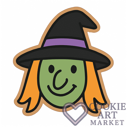 Embrace the spooky spirit of Halloween with this witch face illustration, tailored for cookie cutter enthusiasts. The clean, flat design and simple color palette make it an excellent choice for adding a touch of festive flair to your seasonal baking adventures.