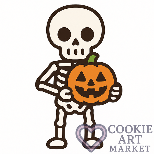Get ready for a spooky treat with this delightful illustration of a skeleton holding a jack-o-lantern. Perfect for Halloween cookie cutters, the design features a charming combination of simple, vibrant colors and a playful tone.