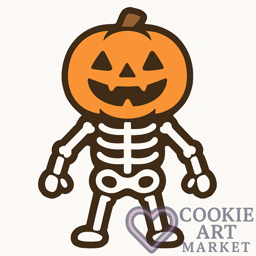 Boo! Here’s a spooktacular illustration of a skeleton with a jack-o-lantern head, perfect for your Halloween cookie designs. This flat, clipart-style image is as festive as it is fun, sure to add a playful scare to any treat.