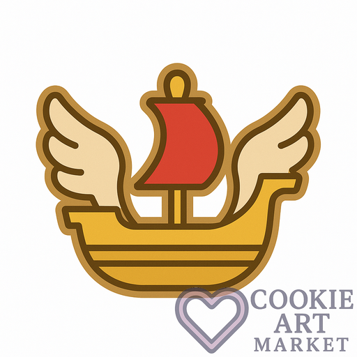 This flat, clipart-style image presents a winged boat, an intersection of nautical and aerial transportation in the realm of fantasy. Designed without shadows or gradients, the illustration maintains a clear, bold outline, ideal for cookie cutter art.