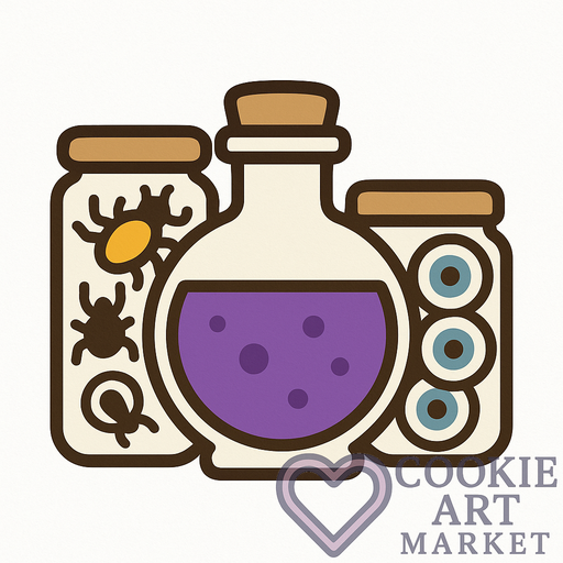 Get ready for a Halloween baking adventure with this eerie illustration! Featuring a round potion bottle and spooky jars of bugs and eyes, it’s perfect for creating themed cookies. Designed in a flat, clipart style, this image highlights the playful side of Halloween.
