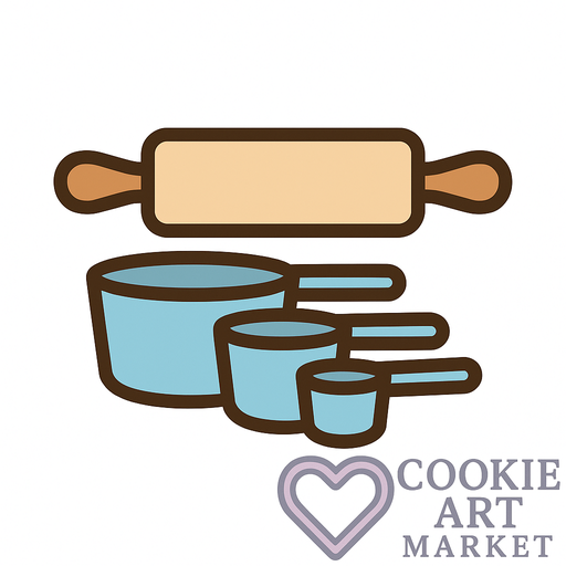 Explore the heart of home baking with this simple yet striking illustration. A rolling pin and measuring cups are depicted in flat design with a bold, dark brown outline, making it an ideal choice for cookie cutter designs or kitchen-themed decor.