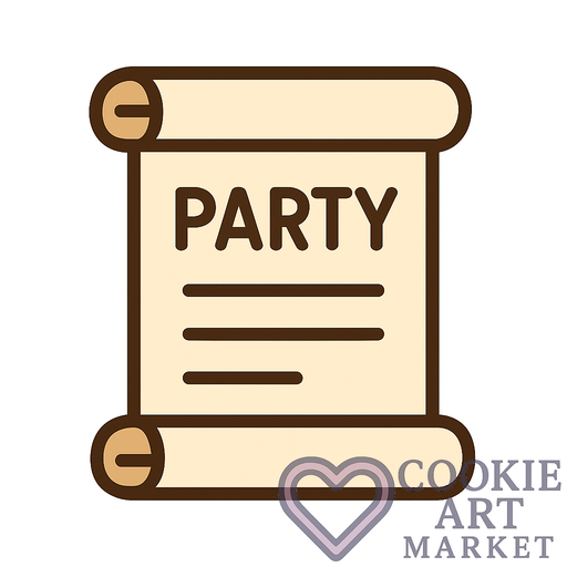 Capture the essence of a festive gathering with this elegant invitation scroll illustration, crafted for cookie enthusiasts. Designed in a straightforward, flat style with a clean, white backdrop, it embodies simplicity and charm, enhanced by a defining dark brown outline.