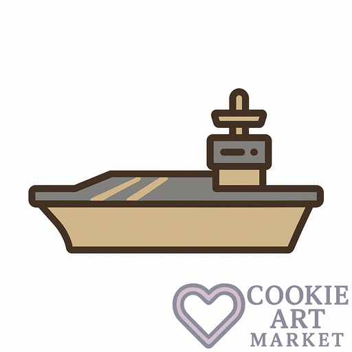 This playful illustration transforms an aircraft carrier into a delightful cookie cutter design, perfect for nautical-themed baking adventures. Designed with simplicity in mind, it features flat colors and a clean outline against a bright white background.