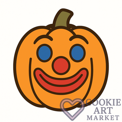 Get ready to giggle with this quirky Jack-o-lantern sporting a clown face! Perfect for Halloween cookie designs, this clipart-style illustration uses bold colors and a playful expression to bring a touch of whimsy to any seasonal treat.
