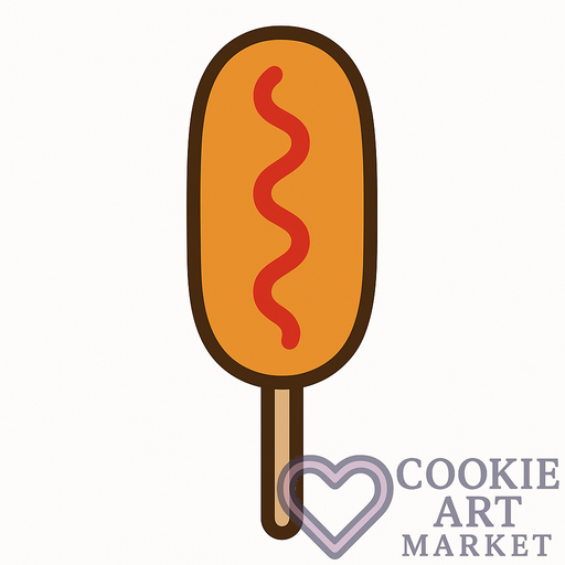 This illustration presents a hot dog on a stick with a clean, simple look optimized for cookie cutter designs. The straightforward depiction makes it ideal for entertainment-themed baking projects.