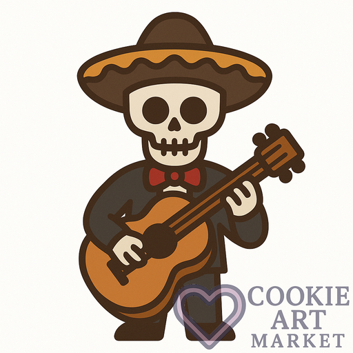 In a celebration of life and legacy, our skeleton mariachi stands ready to serenade the souls. Clad in festive attire and wielding a guitar, this illustration brings the vibrancy of Dia de los Muertos to life, perfectly crafted for cookie enthusiasts.