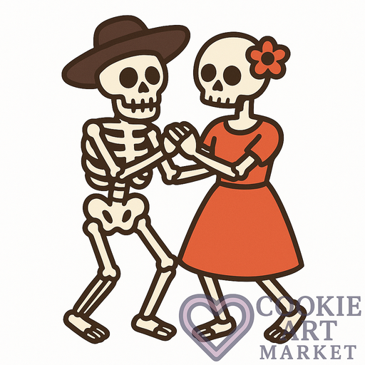 This playful illustration captures a skeleton couple dancing joyously, perfect for Day of the Dead celebrations. With a simple, flat design and dark brown outline, it’s ready to be transformed into a festive cookie cutter design.
