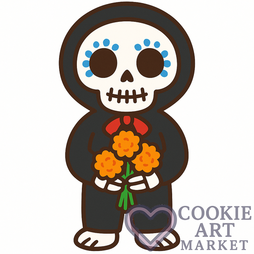 Experience a cultural symphony in this formal depiction of a skeleton child holding marigolds, crafted specifically for Day of the Dead celebrations. The clean lines and vivid colors make it an ideal template for cookie cutters, blending tradition with festive flair.