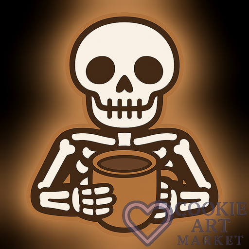 This formal rendering captures the essence of the Day of the Dead with a skeleton calmly sipping hot chocolate. Designed with precision for cookie cutter illustrations, it features a clean, crisp presentation on a pure white background, outlined in dark brown for distinctiveness.