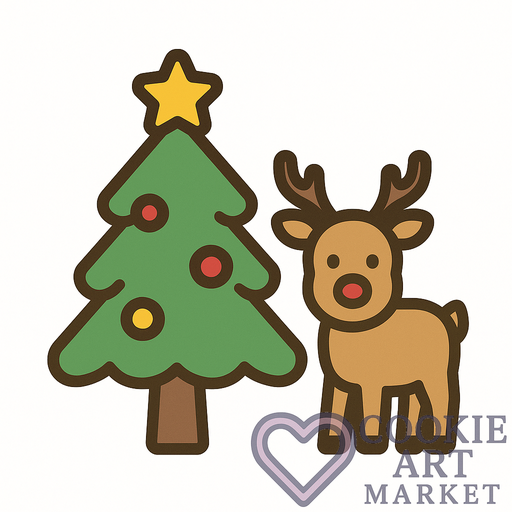 This formal illustration features a classic Christmas motif: a reindeer and tree, rendered in flat, solid colors with precise outlines. Crafted specifically for cookie cutter applications, it provides a charming yet practical representation of holiday spirit on a pristine white background.