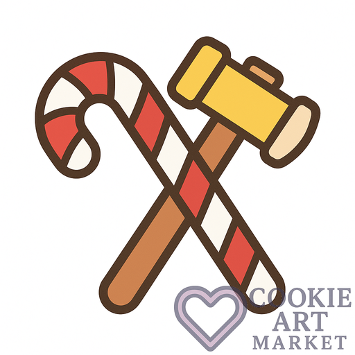 A whimsical amalgam of a candy cane and toy hammer captures the essence of Christmas cheer. This flat, minimalist illustration in vibrant solid colors is a perfect representation of joyful holiday spirit, ideal for cookie decoration.