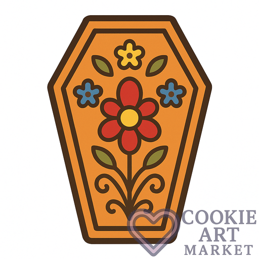 Celebrate the Day of the Dead with this charming coffin cookie design, adorned with delicate floral carvings. Its simple, flat style and bold outline make it perfect for festive cookie creations.