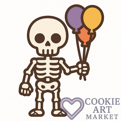 This formal illustration presents a front-view skeleton holding balloons, crafted in a flat, clipart style. Designed for Day of the Dead festivities, its dark brown outline provides a distinct cookie cutter edge, ensuring it stands out with elegance and clarity against a pristine white background.