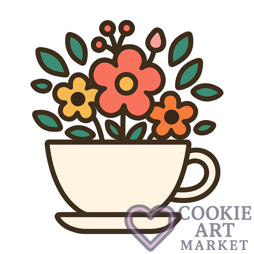 This illustration captures the charm of a floral bouquet nestled within a delicate teacup, perfect for adding a touch of elegance to your kitchen. Its simple, solid colors and clear outlines make it an ideal design for cookie cutter enthusiasts.