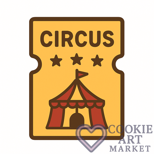 Step right up to a world of wonder with this flat, clipart-style Circus ticket stub illustration. Featuring a simple, solid color palette and a bold brown outline, it’s designed to bring the magic of the big top to life in cookie form.