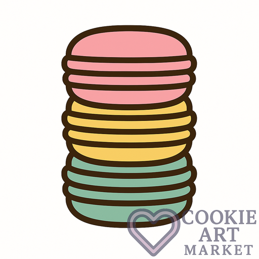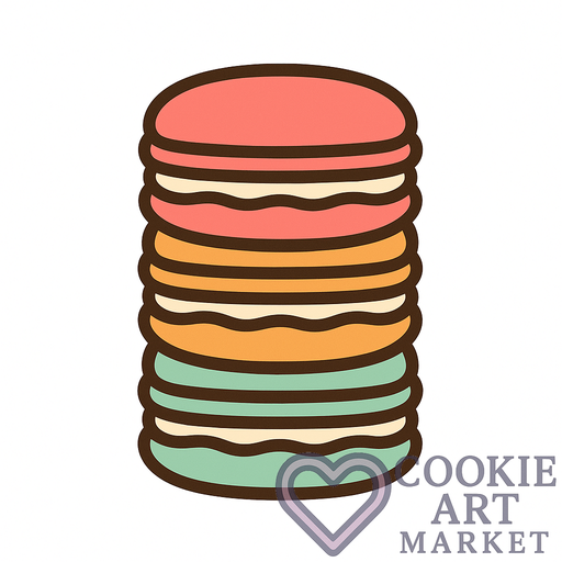 Introducing a delightful stack of macarons, perfectly captured in a flat, clipart style. This sweet illustration, outlined in dark brown, is perfect for any dessert lover’s collection.