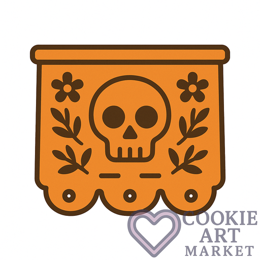 A vibrant depiction of a papel picado banner, this illustration showcases a skull motif that dances across the canvas. It invites you to celebrate the Day of the Dead in style, with a touch of traditional charm on a cookie canvas.