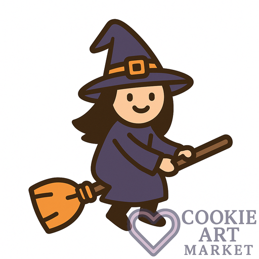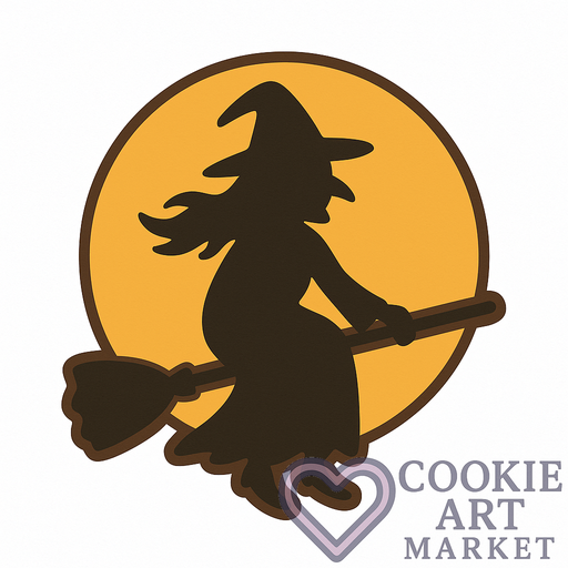 This formal representation showcases a witch in flight, designed with precision for cookie artistry. The illustration uses basic colors and a distinct outline to ensure clarity and elegance, embodying the essence of Halloween.
