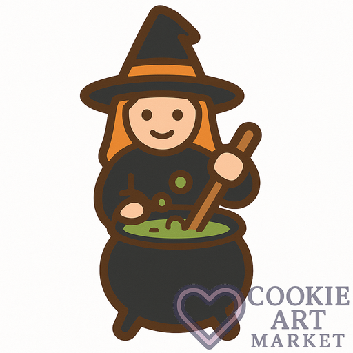 Brew up some Halloween magic with this delightful illustration of a witch stirring her cauldron! Perfect for cookie cutter designs, this playful piece captures the spellbinding spirit of the season with its simple, bold colors and charming character.