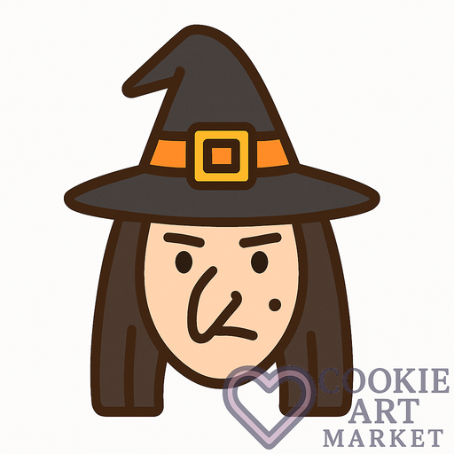 In the realm of bewitching delights, this witch’s visage stands out with striking simplicity. A front-facing, flat design captures the essence of Halloween, complete with a long nose and iconic chin wart, ready to adorn your seasonal cookies.