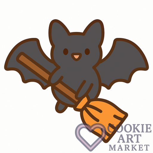 Presenting a front-view illustration of a bat, whimsically perched on a witch’s broomstick. This design, optimized for cookie cutters, showcases a clean and simple aesthetic with solid colors, ensuring your holiday treats are both charming and spooktacular.